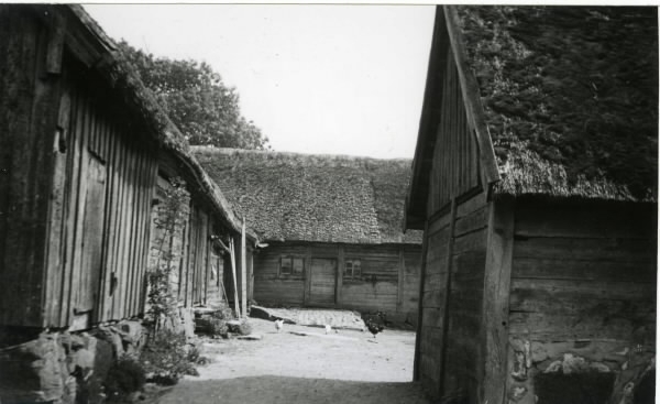 Klädegård, Källstorp 1:3, "Johns i Tjädre". Kringbyggd bondgård, med halmtak, små fönster och väggar i skiftesverk. Byggnaderna revs på 1950-talet.