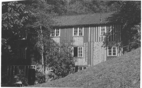 Kvarn. Brogrens kvarn i Släp, som från detta håll har tre våningar med fönster. Delar av fasaden har bytts ut. Något vattendrag syns ej på fotografiet. (Se även bildnr G8793-G8796)