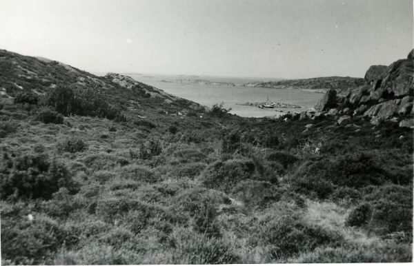 "Havsvy från Boethius område mot Sandö och Ginglaholmen." Sänka mellan bergen bevuxen med bl a ljung och enar.