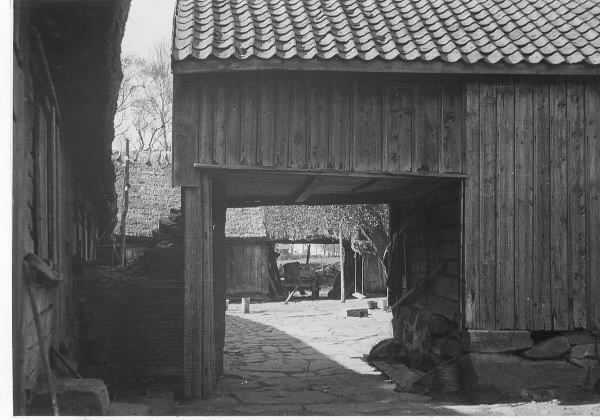 Lantgård mellan Idala och Gällinge. Vy via portlider över kringbyggd och stensatt gårdsyta, mot ett portlider i längan mitt emot. Ladan närmast i bild har enkupigt tegel på taket medan den andra är belagd med stråtak.