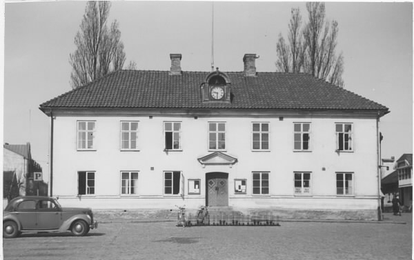 Falkenbergs rådhus sett från Rådhustorget. Framför byggnaden står ett cykelställ och till vänster är en bil parkerad.