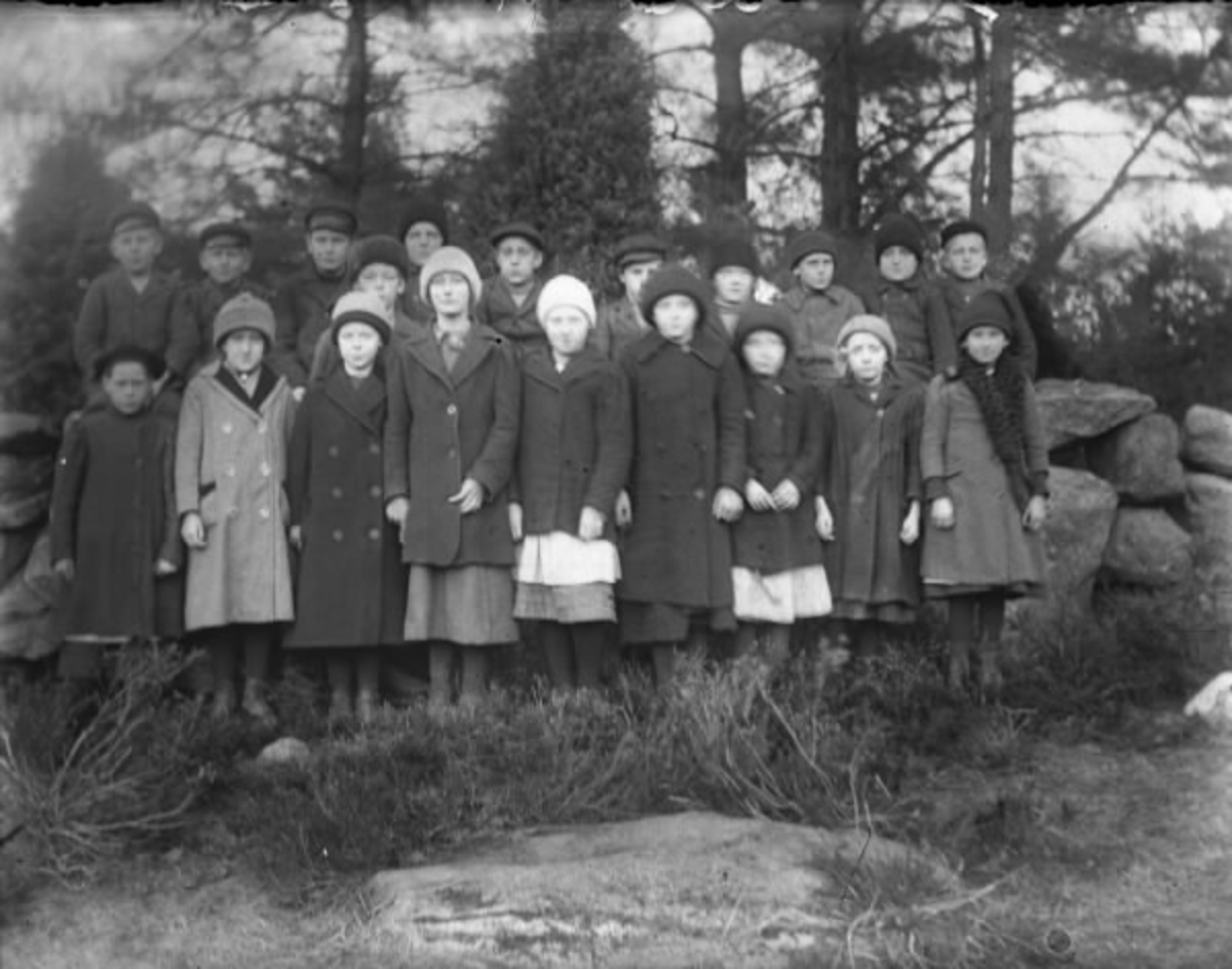 Gruppbild, skolfoto (?) i utomhusmiljö. skog