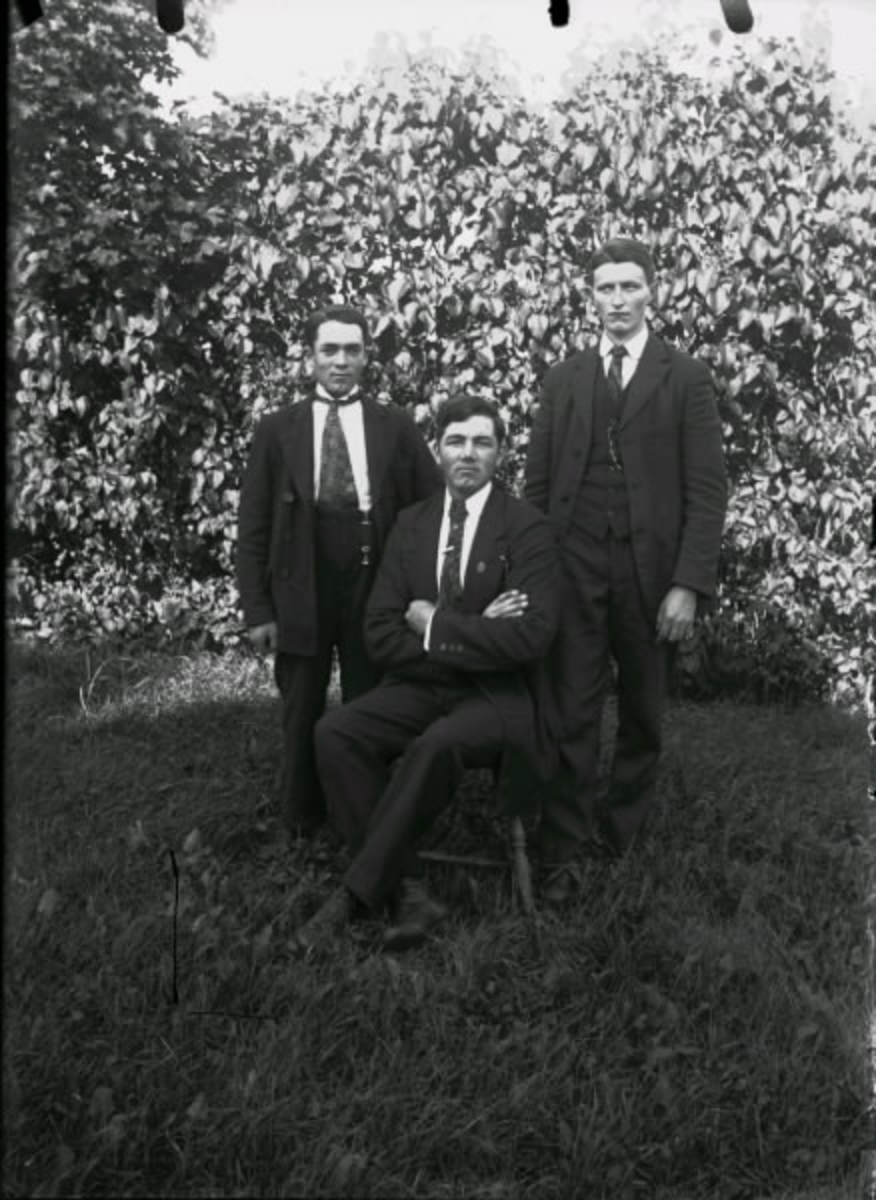 Bror W Johansson, föreståndare för Inköpsföreningen, Hilmer Alexandersson och Karl Alexandersson, Alla tre är klädda i slips och kostym. Bilden är tagen i en trädgård i Höghult, Drängsersed socken.
