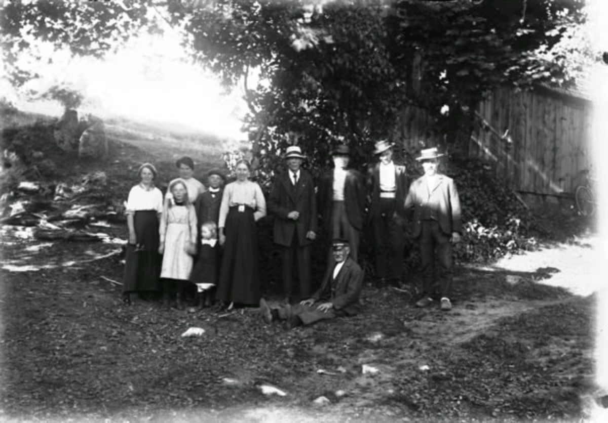 En grupp med kvinnor, män och barn vid ett träd. Måsared