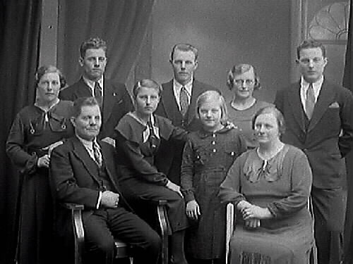 Lars Svensson i Galtabäck med frun Berta och sju barn. Arrenderar Galtabäck 4, Lars Börjesgård och Galtabäck 6, Torsgården. Ägare till gårdarna Carl Svensson, Galtabäck 4. I bakre raden står barnen Anna, Karl-Erik, Sten, Karin och Åke. Mellan föräldrarna står Lisa och Kerstin.
