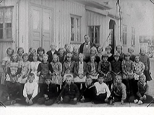 Skolfoto. Skollärare Thulin med skolklass utanför Norvära skola, Värö.