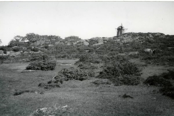 Vy över en enebacke upp mot väderkvarnen på berget i Lahall, Värö.