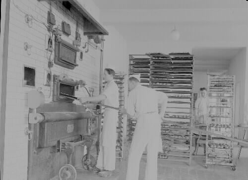 Bagare i arbete på Judit Svenssons bageri i Varberg, Engelbrektsgatan 14. Kv Östertull 303. Bild 1 visar två män vid den stora ugnen och plåtvagnar med färdiga bröd i bakgrunden. Bild 2 visar bagare som inspekterar färdiga limpor på den stora brödplåten på hjul, utdragen ur ugnen.