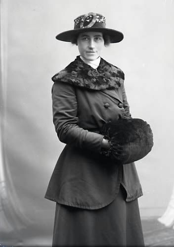 Ateljéfoto, kvinnoporträtt i hatt och muff, beställare: Hulda Bengtsson.