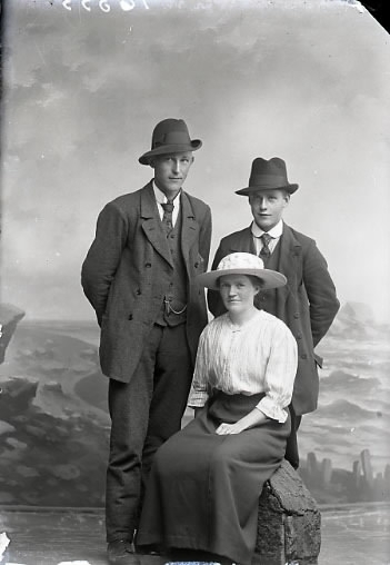 Ateljébild med en sittande kvinna och två män stående bakom henne. Troligen makar med son. Beställare: Ester Klar.