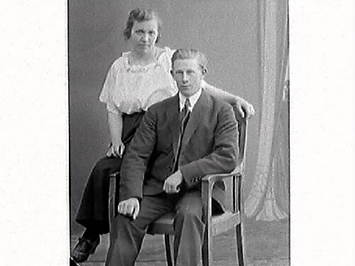 Ateljebild med en yngling som sitter i en stol och en kvinna sittandes på ena armstödet med armen bakom mannen. Ester Andersson Limmanäs, Fjärås beställde bilden och är troligen själv med.