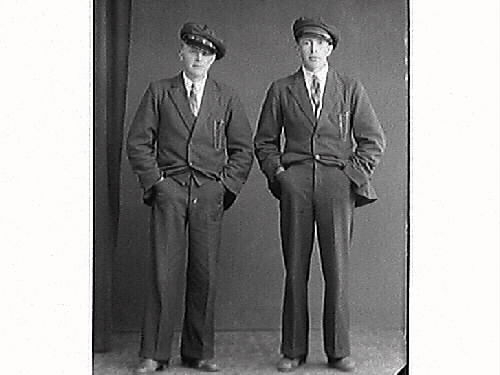 Två män i kostym och stora kepsar står med händerna i byxfickorna. Gustav Andersson, Karsagård i Spannarp, beställde bilden och är troligen själv med.