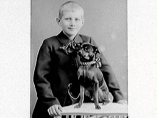 Porträtt av en pojke och en hund. Båda har rosett om halsen. Beställare: Jenny Andersson, Almeberg, Varberg, troligen pojkens mor.