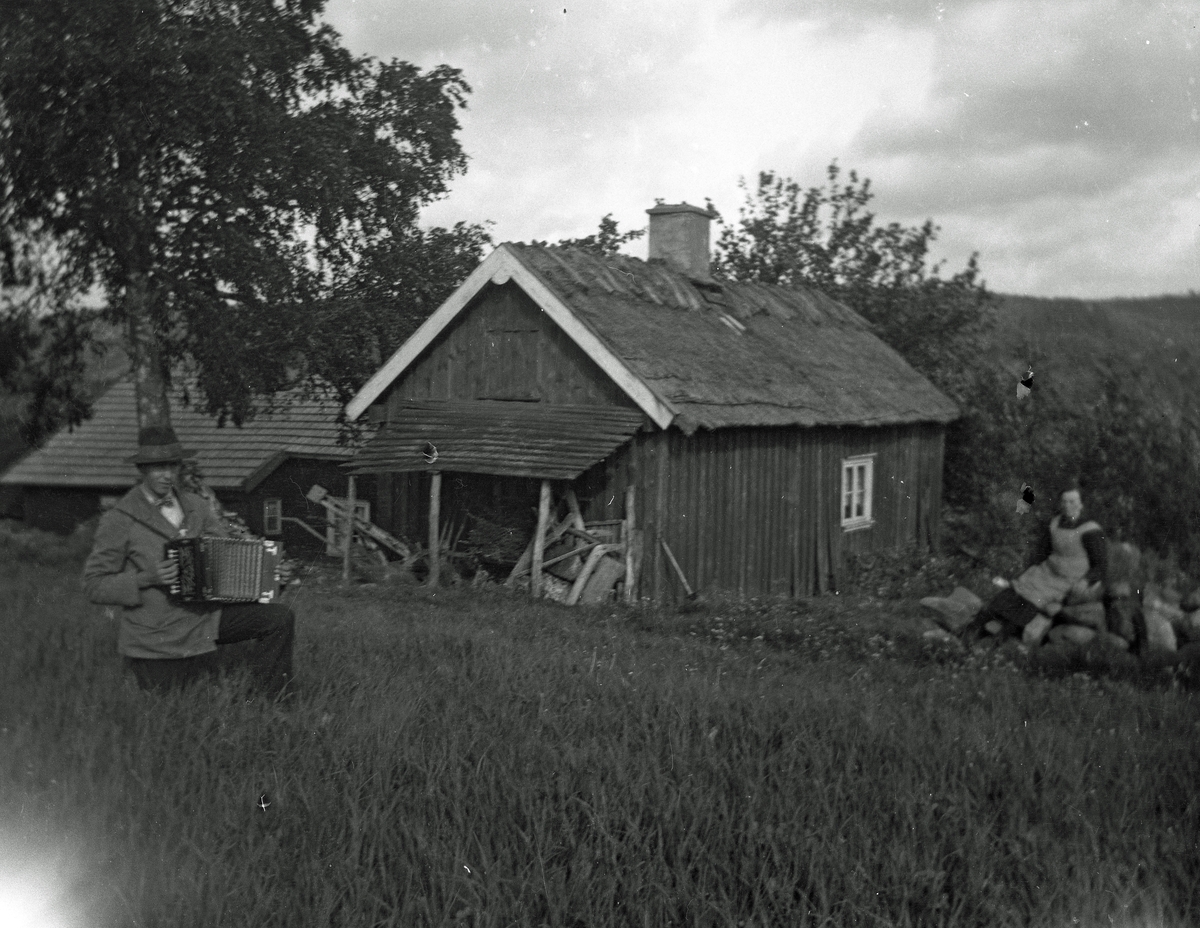 En man står på ängen och spelar på ett litet dragspel (durspel troligen) vid f d Torsorrens stuga. En kvinna sitter och hör på.