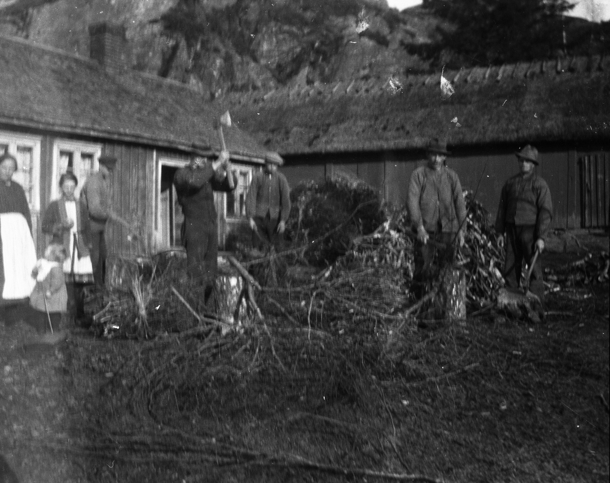 Vedhuggning på Lilla Barkhult, Ry Veddige. Fem män med yxor och huggkubbar av björk är engagerade i att förvandla rishögar till ved. Ett par kvinnor och ett litet barn är också med på bild.