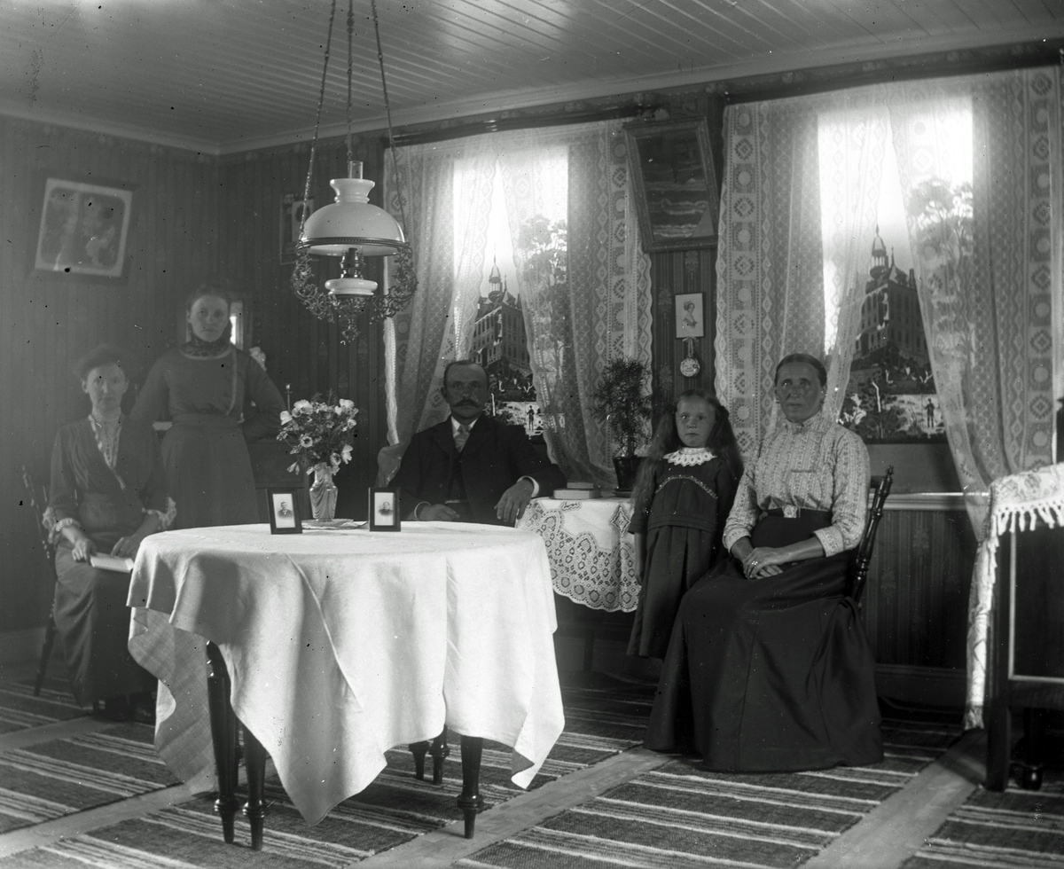 Tre kvinnor, en man och en liten flicka samlade i finrummet i "Kransens stuga", Istorp. För att inte få för skarpt motljus har rullgardinerna dragits ned, ivlka har dekor av någon pampig byggnad i parkmiljö. Trasmattorna ligger på rad längs golvet och bordet pryds av sommarblomster i glasvas.