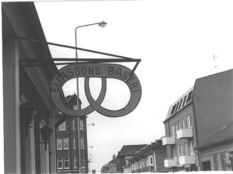 Butiksskylt i form av en kringla till Eliassons bageri i Varberg, kv Hattmakaren 3, Kyrkogatan.