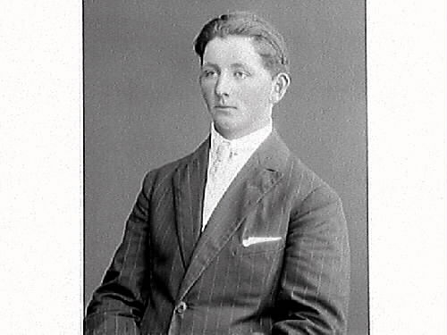 Ung man i kritstrecksrandig kavaj. Ingrid Bengtsson i Apelviken, Varberg beställde bilden. (Se även GB3_19364, troligen är de syskon och Ingrid deras mor)