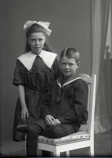 Syskonbild med pojke med sjömanskrage och flicka i mörk klänning med stor vit snibbkrage och rosett i håret. Beställare: Tora Lambert.
