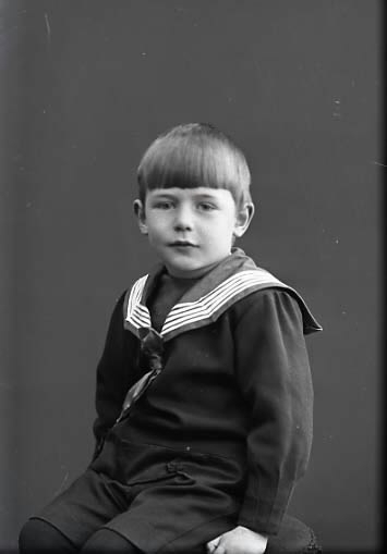 Pojkporträtt, sittande pojke med sjömanskostym. Beställare: Hedenberg, Helsjön.