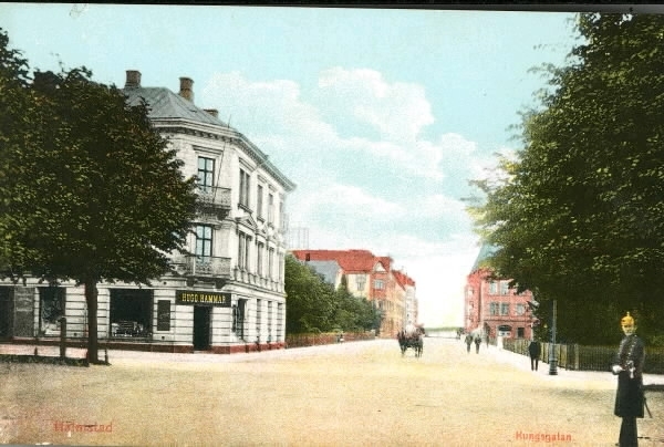 Kolorerat vykort, "Halmstad. Kungsgatan." Över antrén till den vita byggnaden står det "Hugo Hammar". Till höger står en konstapel och i fonden ses ett hästekipage.