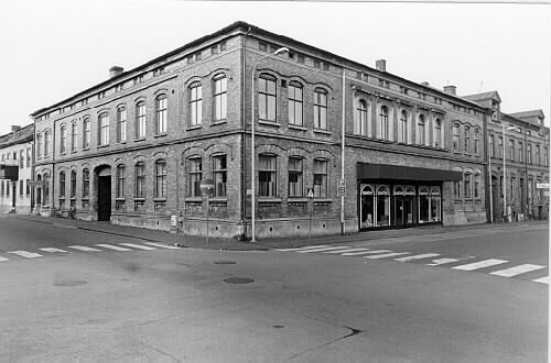 Exteriör av byggnaden i hörnet Torggatan-Östra långgatan. Vid Torggatan till höger syns affären Arons mattor och utmed Östra Långgatan till vänster syns Iris bageri. Bilden tagen mot sydväst under 1980-talet.