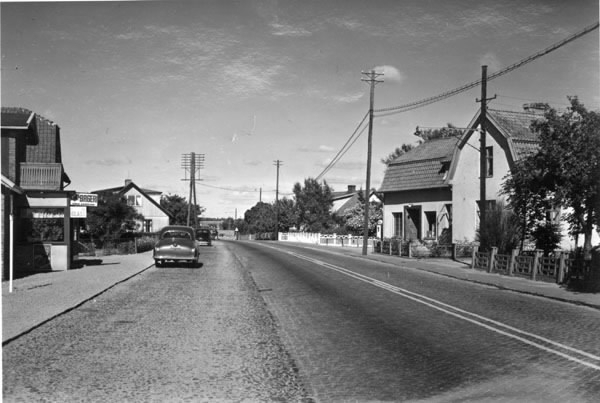 Gata genom Vallberga med bilar parkerade på vänster sida, eftersom högertrafiken ännu inte hade införts. Till vänster ses ett bageri och här finns även glassförsäljning och en bensinstation. Längs vägen står el- och telefonstolpar.