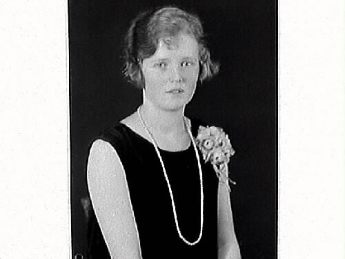 Kvinnoporträtt. Signe Beckman, Varberg iklädd ärmlös klänning med långt pärlhalsband och en dekoration fäst vid vänster axel.