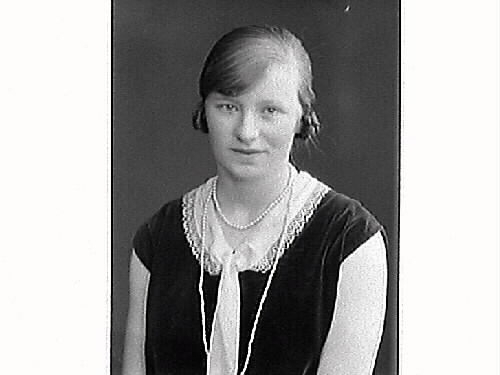 Porträtt av ung kvinna. Agnes Andersson från Lidarna Hunnestad, klädd i ärmlös klänning som har både spetskrage och slips. Långt pärlhalsband.
