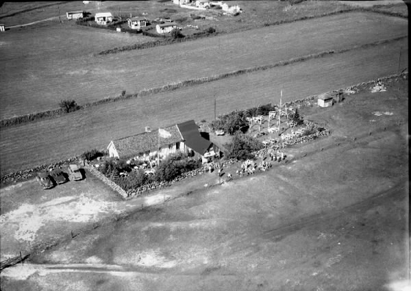 Flygbild över ett konditori/kafé som ligger i ett odlingslandskap och omgärdat av stengärdsgårdar. Några bilar är parkerade till vänster om byggnaden. Upptill i bilden ligger några små badstugor.