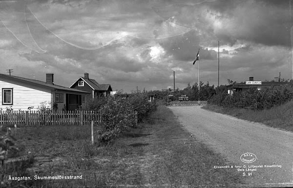 Vykort, "Åsagatan, Skummeslövsstrand." Längs vänstra sidan av vägen ligger fritidshus och till höger ses Tallsätra café och konditoribyggnad. På grinden står det: "Café Konditori".