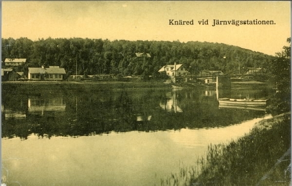 Vykort, "Knäred vid järnvägsstationen." Järnvägsbron över Lagan ses till höger och på den bortre stranden ses olika byggnader.