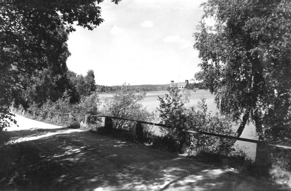 Landsbygdsvy. Väg och vägräcke mellan stenpollare vid Lagan. På andra sidan ån syns Knäreds kraftstation.