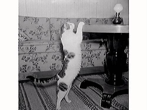 En katt sträcker sig upp mot soffbordet för att se vad som finns där uppe.