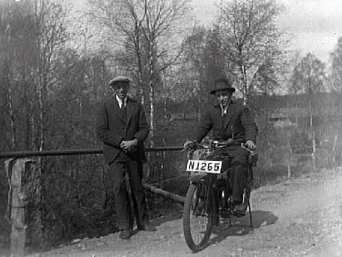 Två män på en grusväg. Mannen som sitter i hatt på motorcykeln, med stödet nedfällt, är Gösta Karlsson i Våghult, Krogsered.