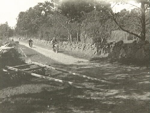 I Breshult Gällared fanns en syskonskara med flera bröder som hade motorcykel. Några av dem är med på denna sommarbild, där de kommer åkande längs en smal grusväg, kantad av en stengärdsgård. I förgrunden ligger en ringvält och på andra sidan stenmuren står hässjor.