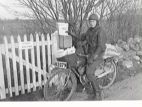 Lantbrevbärare på lätt motorcykel med registreringsnummer N2079. Text på grinden: Villa Nygård. Brevbäraren håller ett exemplar av Hallandsposten i handen.