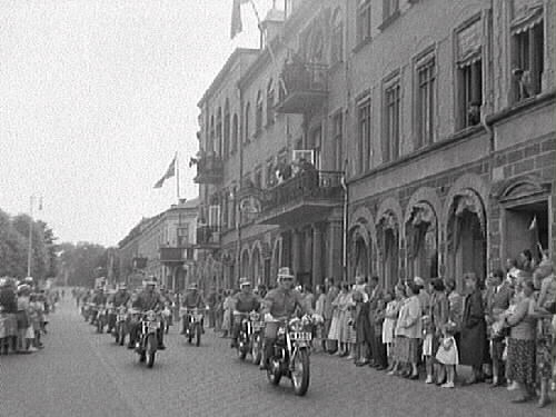 Monarkpatrull/ motorcyklar vid kortegen till Monark i samband med kungabesöket i Varberg 1954. Artikel i samband med bilden publicerad i Varbergs Tidning 1954-06-23.
