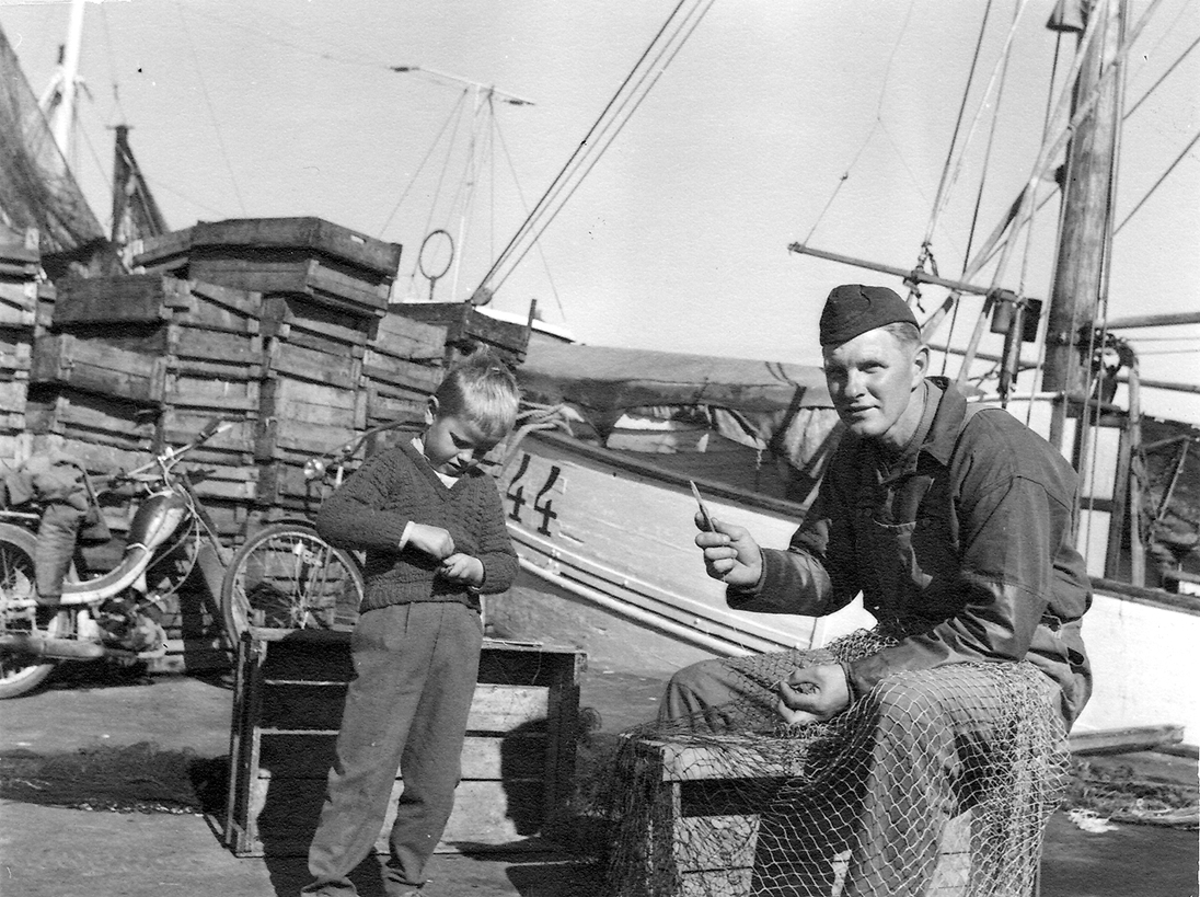 Näten lagas i Bua hamn, 1960-tal. En ung man lagar nät på kajkanten invid fiskebåten VG44. Bredvid står en liten pojke. Vid en trave fisklådor i bakgrunden står en motorcykel parkerad.