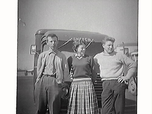 Motorsport. "Ulf Svensson (Varberg) till vänster var mycket aktiv inom motorsport och var flera gånger med i Monaco Grand Prix. Han körde även roadracing och motorcykel och tävlade mycket utomlands. Hans fru i mitten brukade följa med som mekaniker och var känd under namnen 'Johan' (hette Johansson som ogift). Mannen till höger var från Falkenbergs motorklubb och tillsammans med Ulf hade de flera gången blivit svenska mästare i motorcykel. När bilden togs var de på väg med färjan från Varbergs hamn för att delta i en tävling utomlands, Clemont Ferrand i Frankrike."