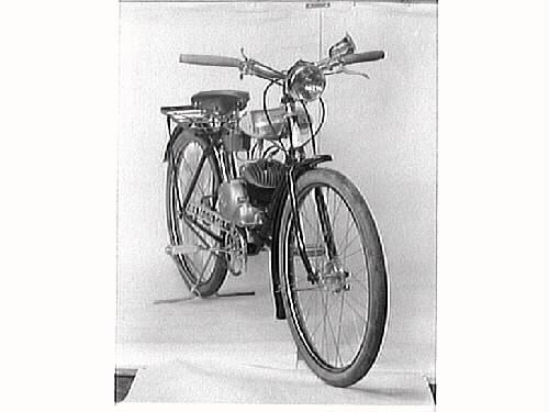 Motorcykel med pedaler sedd snett framifrån.