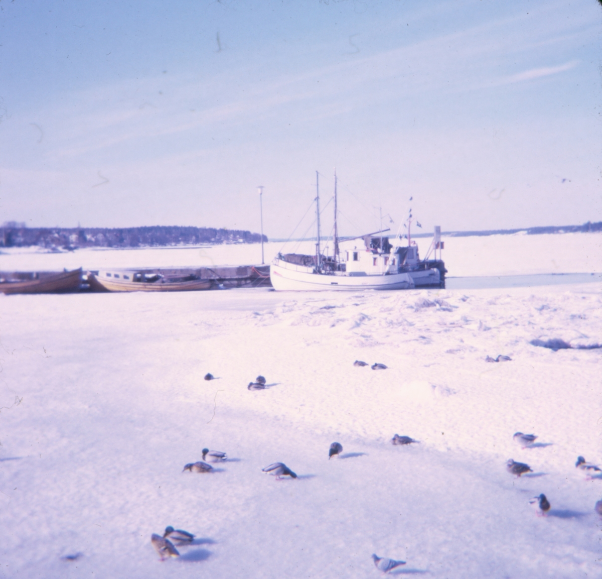 Motiv från Västerviks hamn vintertid, 1970-talets början.