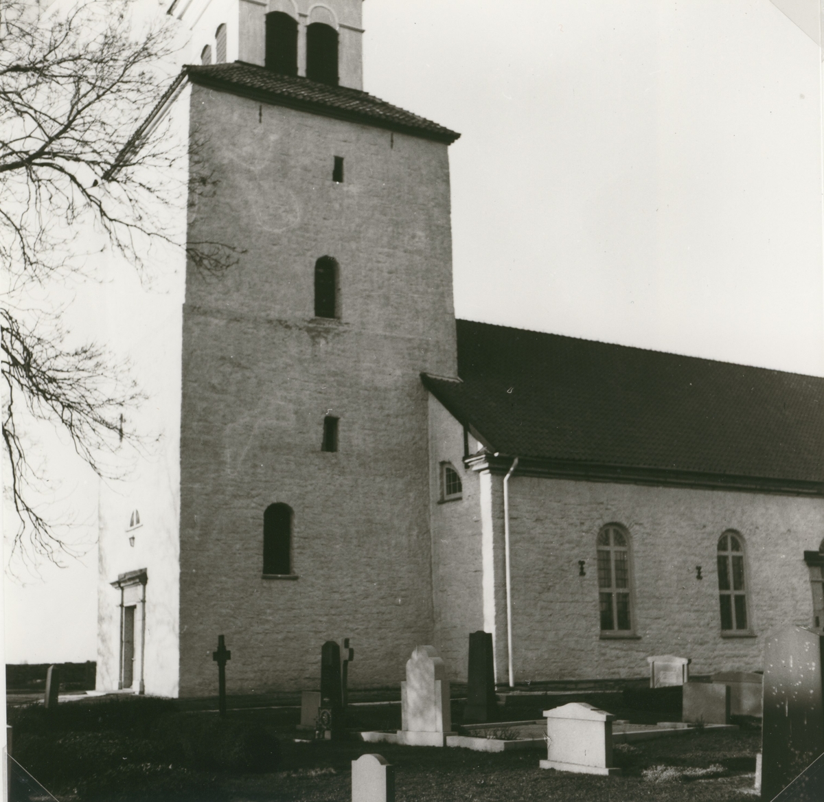 Löts kyrka. Västtornet från sydväst med ny puts.