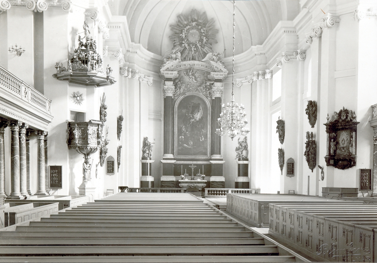 Kyrkorummet i Kalmar domkyrka, sett mot koret. Bilden visar kyrkan före 1914 års renovering vid vilken predikstolen sänktes.