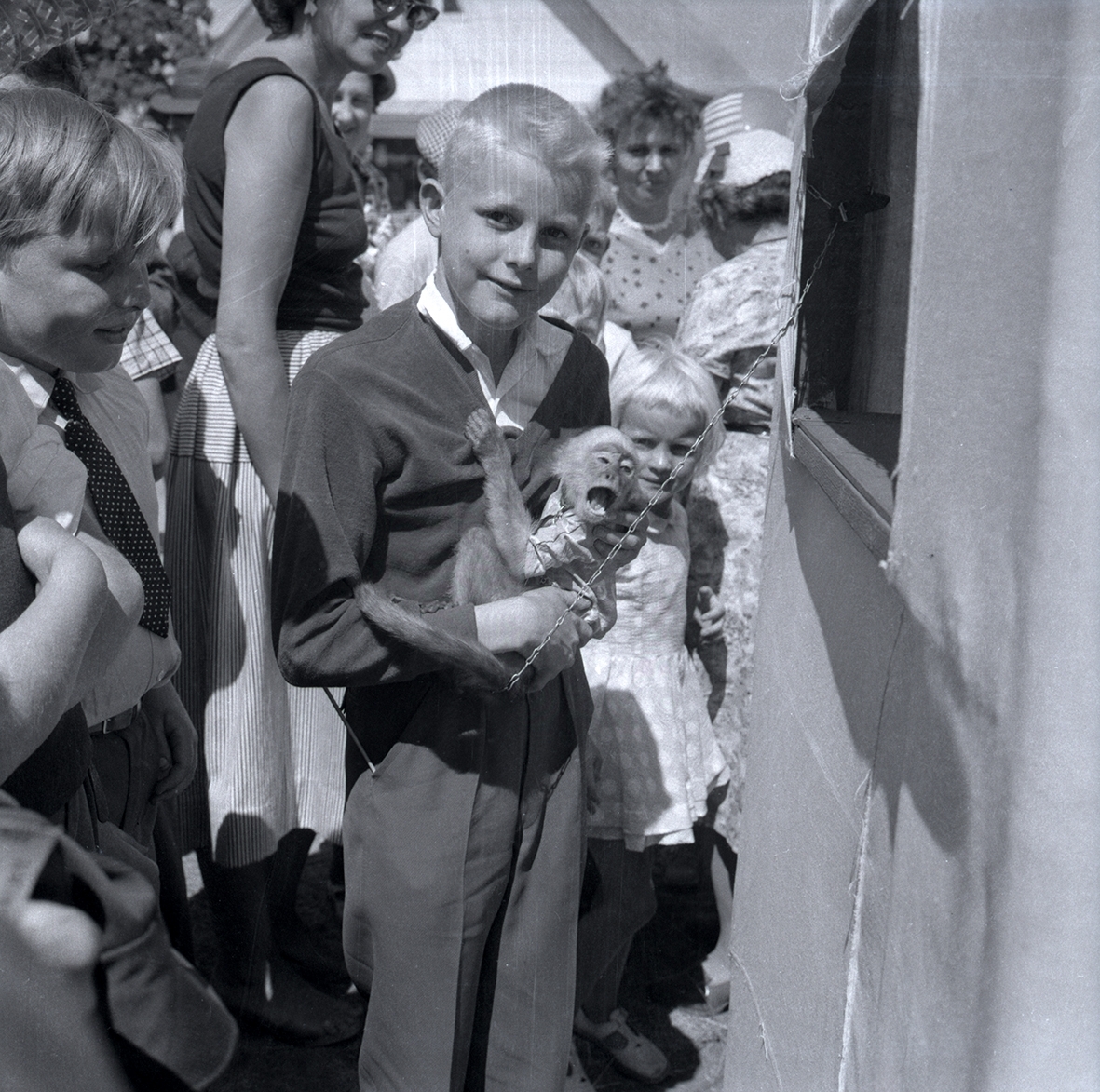 Pojke och apa vid entrén till Algutsrums marknad.
