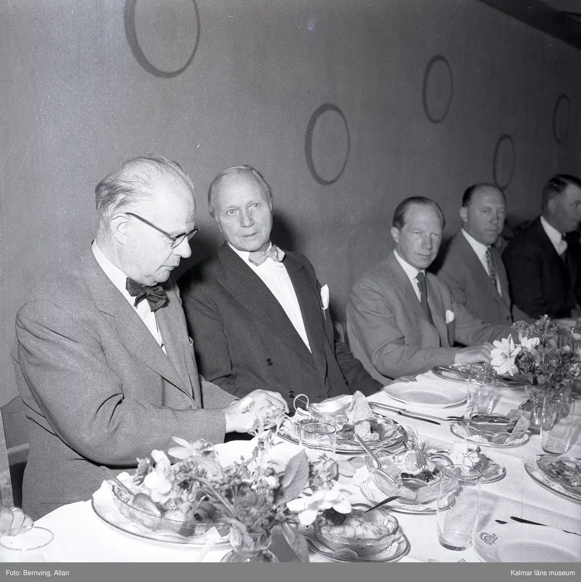 Ruben Wagnsson till vänster och statsråd Eliasson, tredje från höger, vid ett dukat middagsbord.