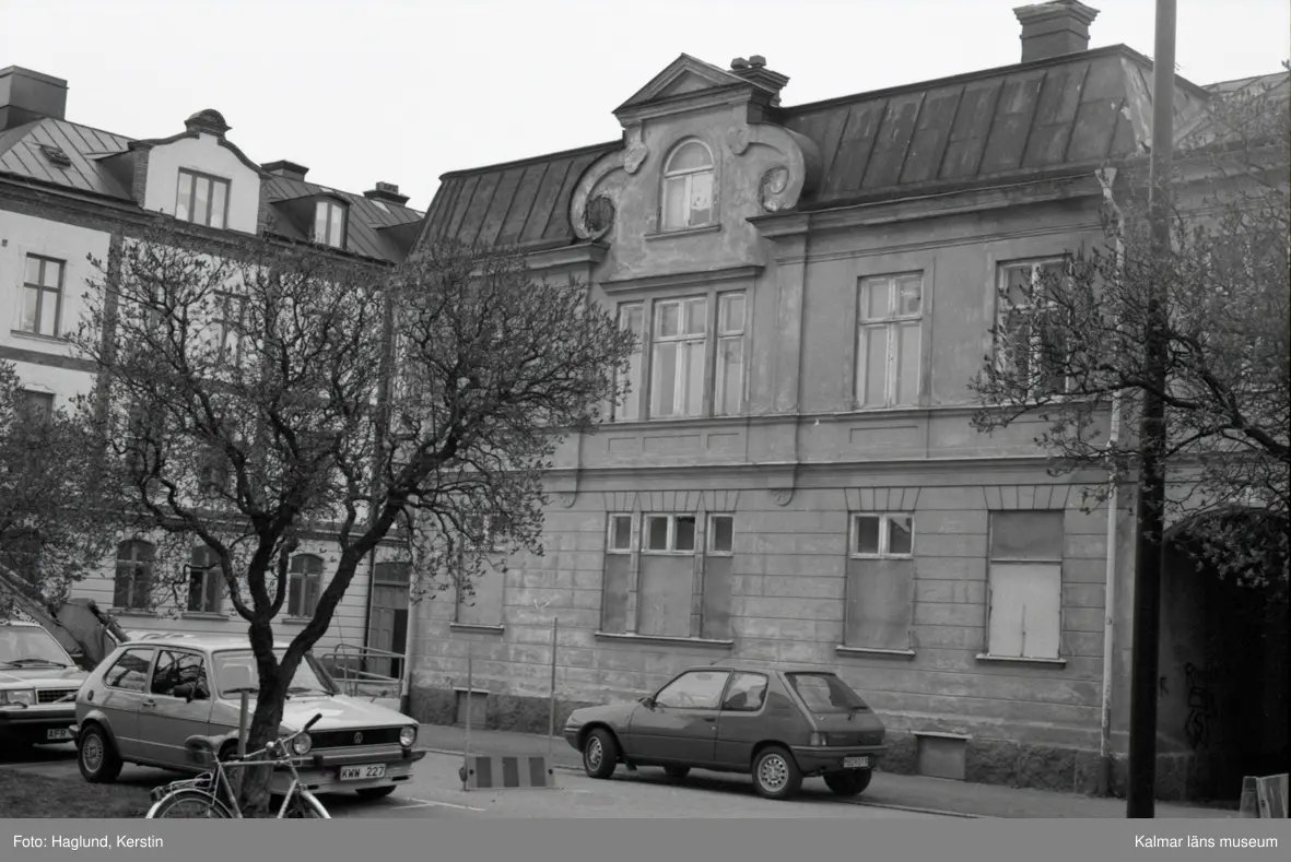 Fastighet på Smålandsgatan-Fabriksgatan. Förfallna bostadshus med plåttak och putsrustik.