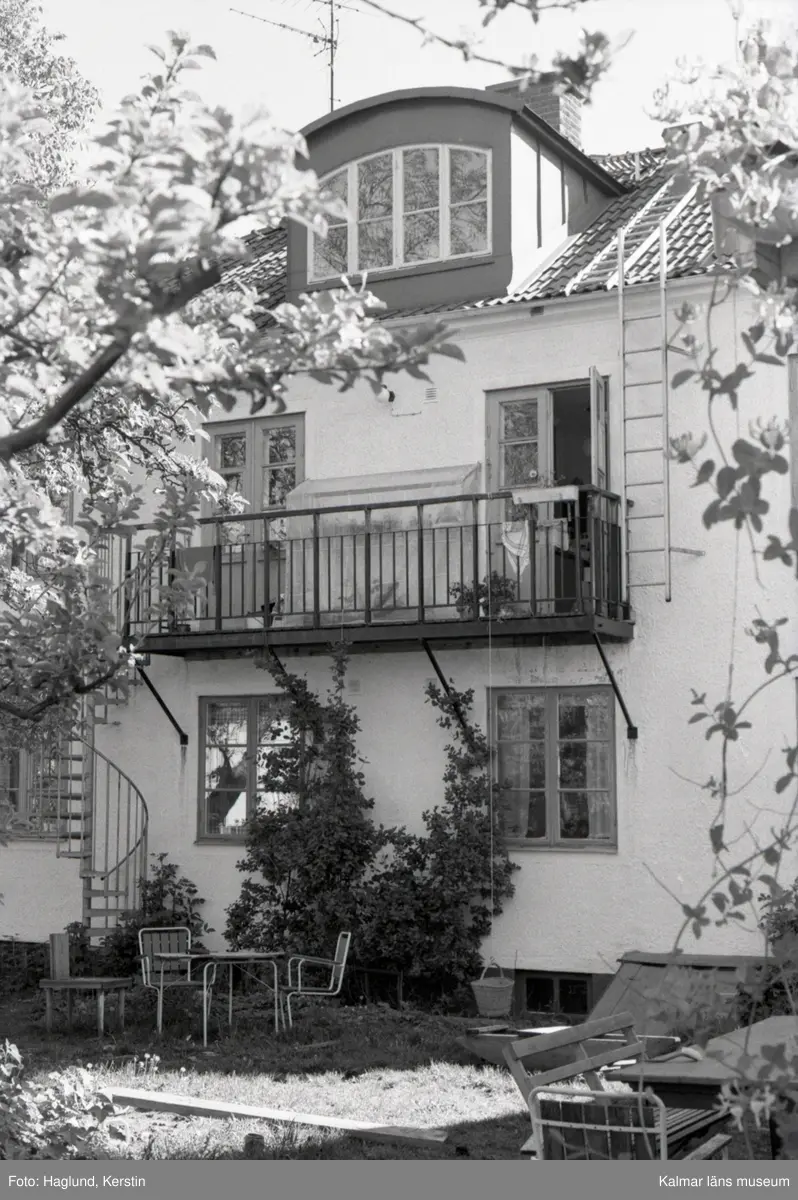 Fastighet i kv. Flädern, tomt 7. Bostadshus med balkong och takkupa.