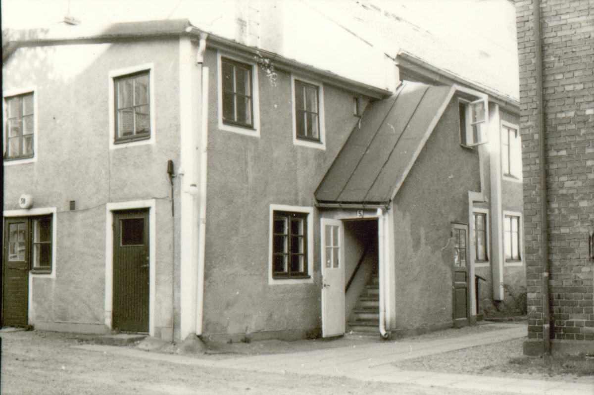 Bostadshus med putsad fasad och trappuppgång i kv Koljan.