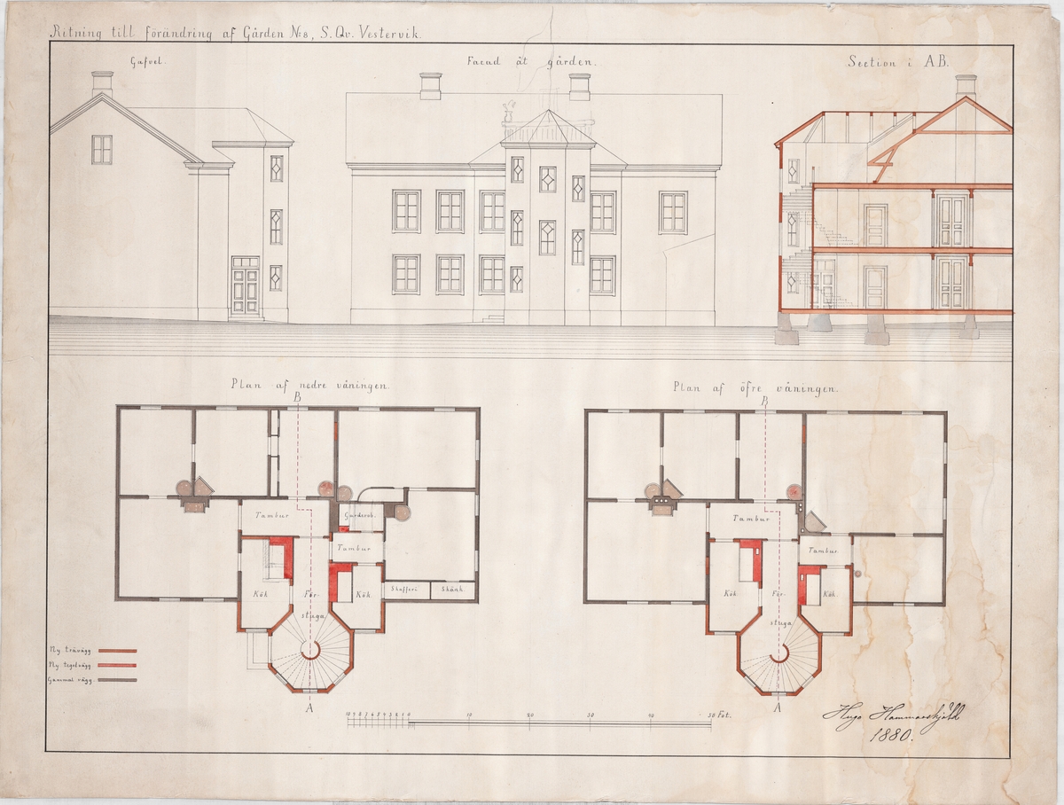 Kolorerad arkitektritning av Hugo Hammarskjöld. Projekt: Porjes gård, förändring. Västervik nr 8 S. Qv. Årtal 1880.